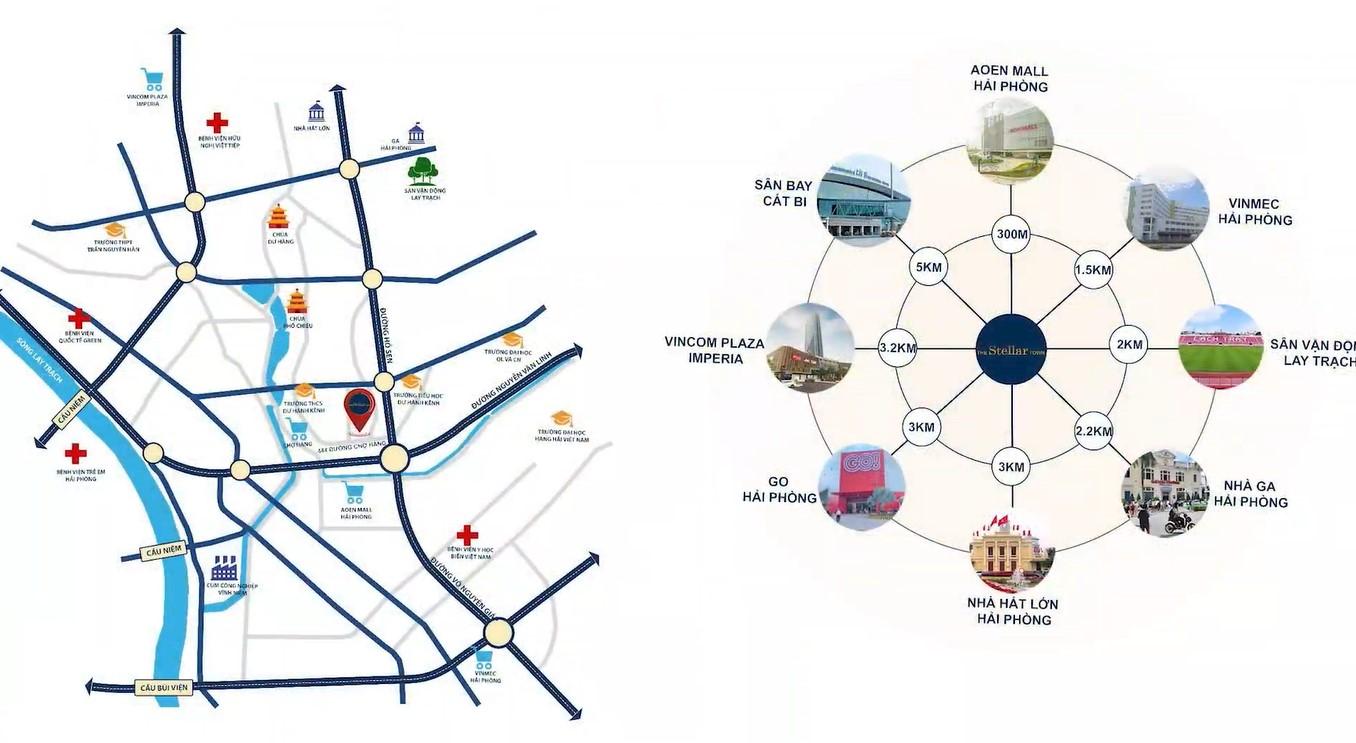 Cùng với đó, cư dân The Stellar Town hòa mình vào tâm điểm sôi động của trung tâm thành phố cảng Hải Phòng và hệ thống tiện ích vùng đa dạng. Từ dự án, bạn có thể dễ dàng kết nối đến các tiện ích hiện hữu xung quanh như Aeon Mall Hải Phòng, Nhà Hát Lớn Hải Phòng, Go Hải Phòng, Vimcom Plaza Imperia, Vinmec Hải Phòng, Nhà ga Hải Phòng, sân bay quốc tế Cát Bi…